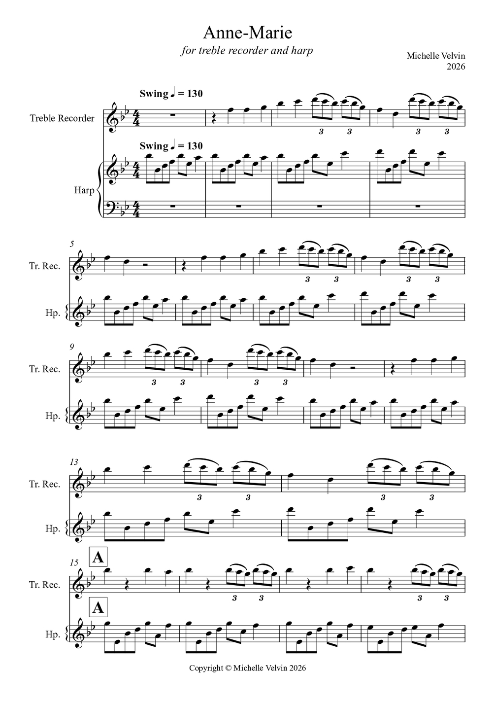 Anne-Marie duet for treble recorder and harp in Bb major