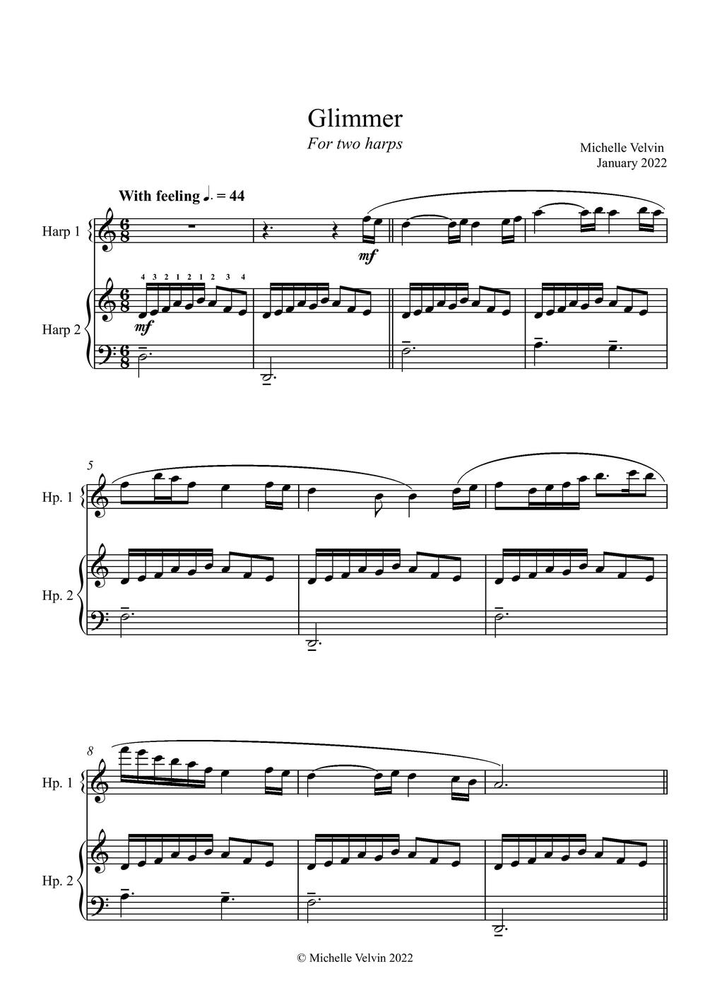 Glimmer is a short duet for two harps, (either lever or pedal). One of the characteristics of this composition is the feeling of syncopation in the melody against the accompaniment when changing between semiquavers and dotted quavers.